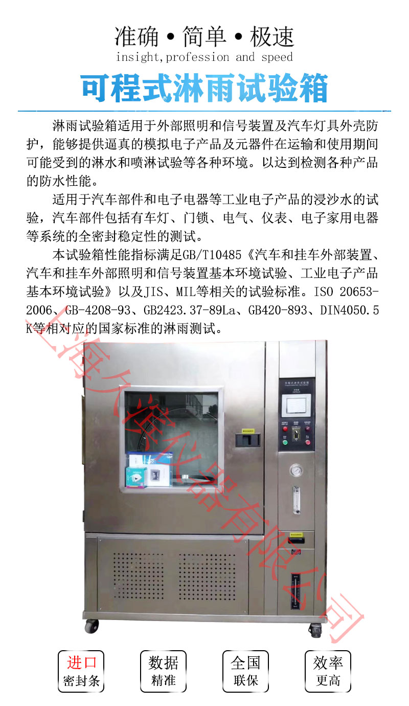 本設備主要用于考核電工電子產品外殼/密封件在水試驗后或者在試驗期間是否能保證該設備及元器件良好的工作性能和技術狀態(tài)。產品技術引用依據,GB2423.38-90和GB/T4942.2-93;GB4208;GB4706;GB7000中有關技術參數(shù)設計制作的。適用人工淋雨試驗。