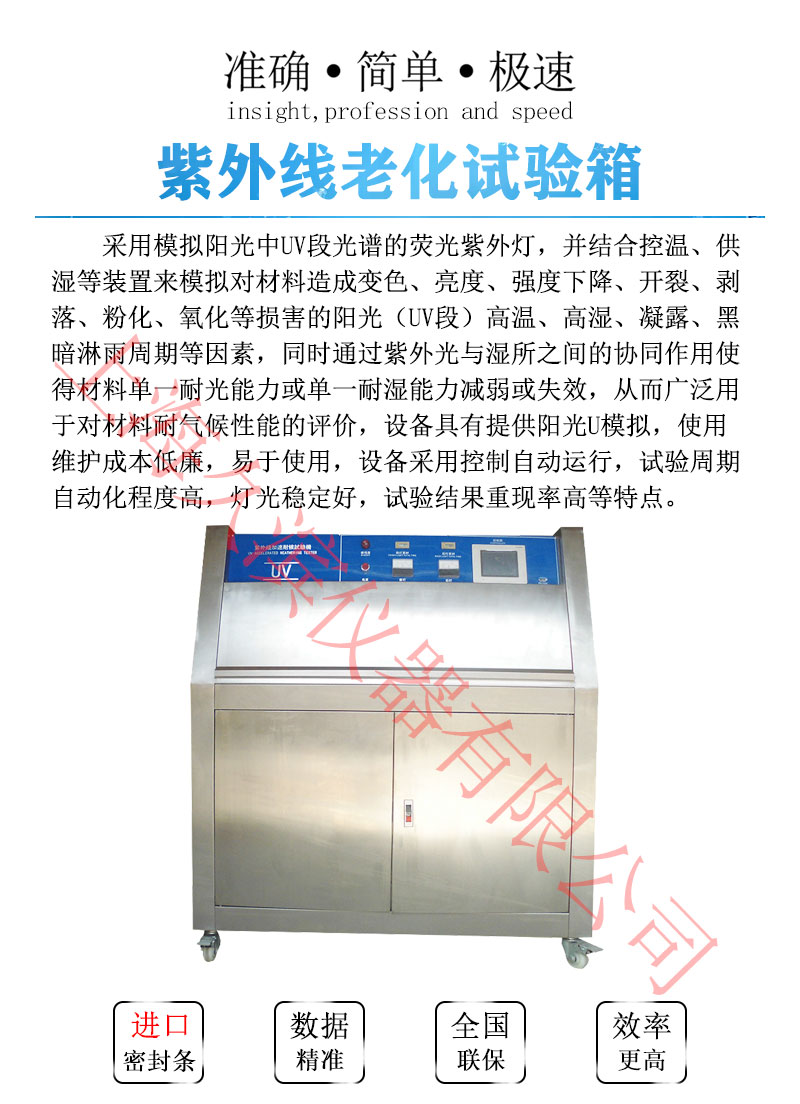 陽光和濕氣對(duì)材料的破壞,每年造成數(shù)以萬計(jì)的經(jīng)濟(jì)損失,紫外光耐氣候試驗(yàn)箱可以再現(xiàn)陽光、露水所產(chǎn)生的破壞。試驗(yàn)箱通過將待測(cè)材料曝曬放在經(jīng)過控制的陽光和濕氣的交互循環(huán)中,同時(shí)提高溫度的方式來進(jìn)行試驗(yàn),試驗(yàn)箱采用紫外線熒光燈模擬陽光,同時(shí)通過冷凝的方式模擬濕氣影響。