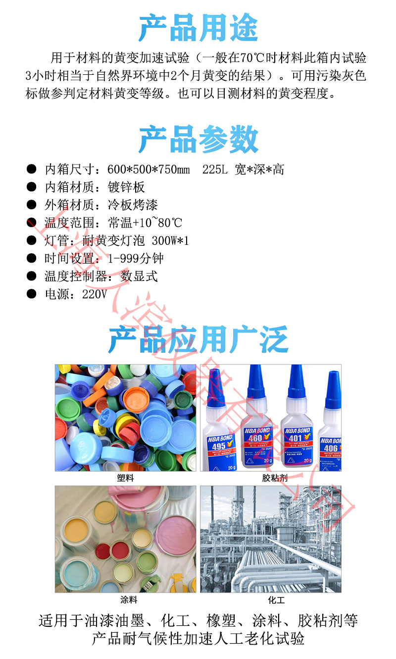 耐黃變照射試驗(yàn)箱適用于陽(yáng)光的紫外線輻照及熱度,試樣于機(jī)臺(tái)內(nèi)經(jīng)紫外線照射與溫度作用,經(jīng)過一段時(shí)間后,觀察試樣變的程度,可用染污灰色標(biāo)作參考。