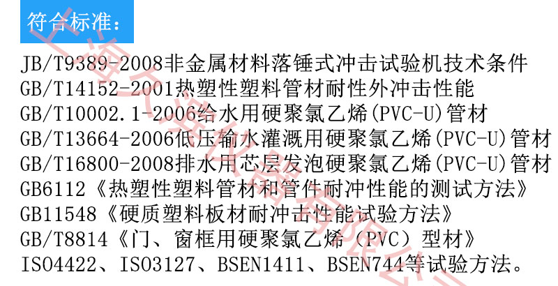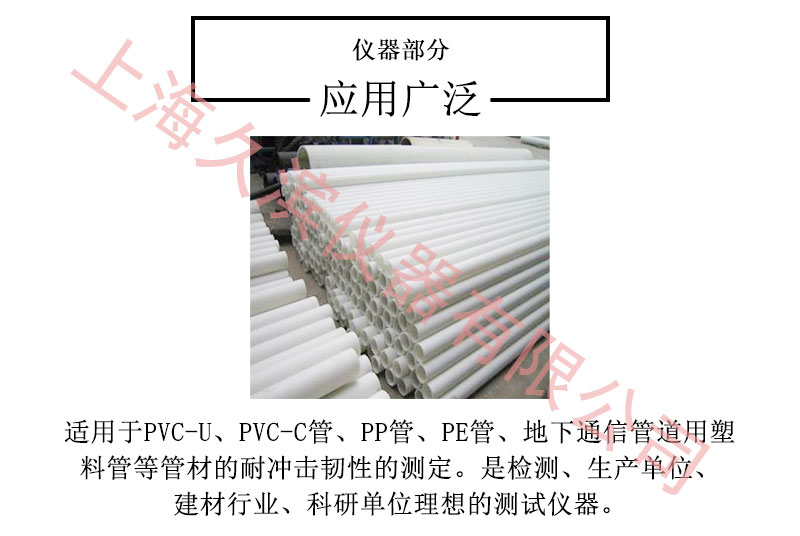 適用于PVC-U、PVC-C管、PP管、PE管、地下通信管道用塑料管等管材的耐沖擊韌性的測定。是檢測、生產(chǎn)單位、建材行業(yè)、科研單位理想的測試儀器。 符合行業(yè)標準JB/T9389落錘式?jīng)_擊試驗機技術條件,滿足GB/T14152、GB/T10002.1、GB/T13664、GB/T16800、ISO4422、ISO3127、BSEN1411、BSEN744的試驗方法。