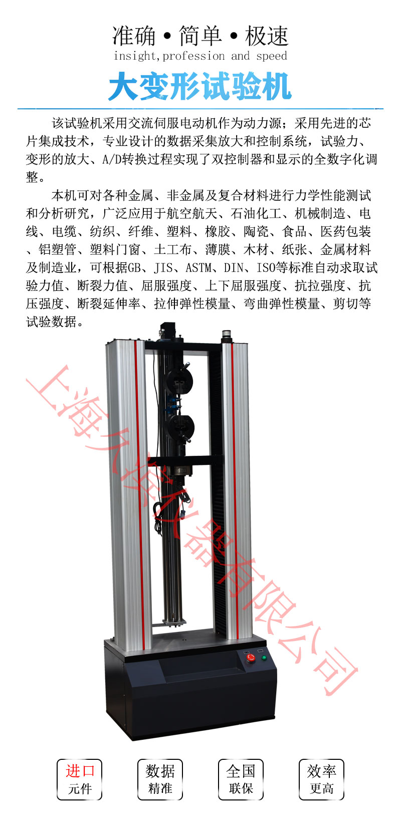 該試驗(yàn)機(jī)采用交流伺服電動(dòng)機(jī)作為動(dòng)力源;采用先進(jìn)的芯片集成技術(shù),專業(yè)設(shè)計(jì)的數(shù)據(jù)采集放大和控制系統(tǒng),試驗(yàn)力、變形的放大、A/D轉(zhuǎn)換過程實(shí)現(xiàn)了雙控制器和顯示的全數(shù)字化調(diào)整。