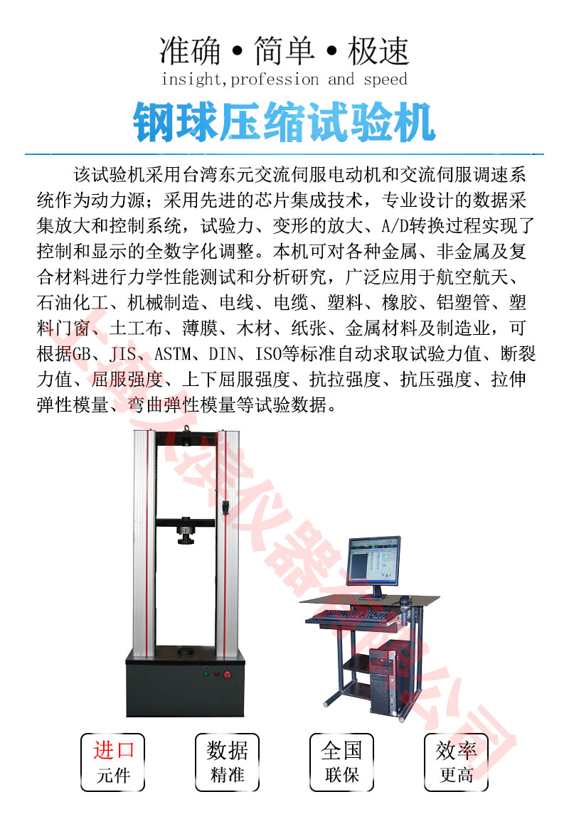 該試驗機采用臺灣東元交流伺服電動機和交流伺服調(diào)速系統(tǒng)作為動力源;采用先進(jìn)的芯片集成技術(shù),專業(yè)設(shè)計的數(shù)據(jù)采集放大和控制系統(tǒng),試驗力、變形的放大、A/D轉(zhuǎn)換過程實現(xiàn)了控制和顯示的全數(shù)字化調(diào)整。本機可對各種金屬、非金屬及復(fù)合材料進(jìn)行力學(xué)性能測試和分析研究,廣泛應(yīng)用航空航天、石油化工、機械制造、電線、電纜、塑料、橡膠、鋁塑管、塑料門窗、土工布、薄膜、木材、紙張、金屬材料及制造業(yè),可根據(jù)GB、JIS、ASTM、DIN、ISO等標(biāo)準(zhǔn)自動求取試驗力值、斷裂力值、屈服強度、上下屈服強度、抗拉強度、抗壓強度、拉伸彈性模量、彎曲彈性模量等試驗數(shù)據(jù)。
