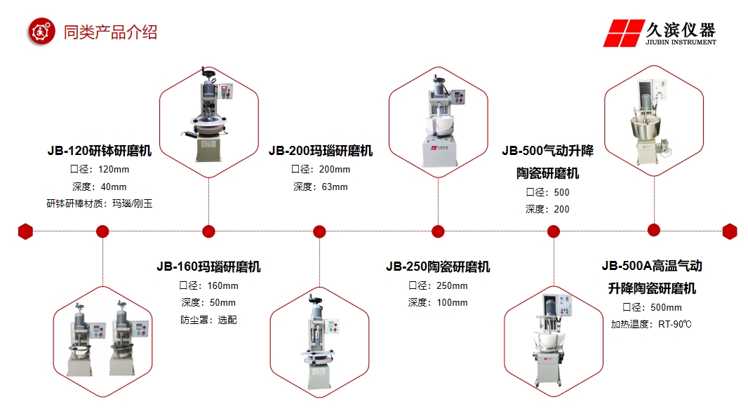 近六年來(lái)的不斷創(chuàng)新研發(fā),目前我們公司定型的研缽式研磨機(jī)產(chǎn)品主要有:JB-100型、JB-120型、JB-160型、JB-200型、JB-250型,JB-500、JB-500A型等7款機(jī)型,成為成熟的系列化產(chǎn)品,為更多的客戶(hù)能選擇到適合自身要求的研磨機(jī)。