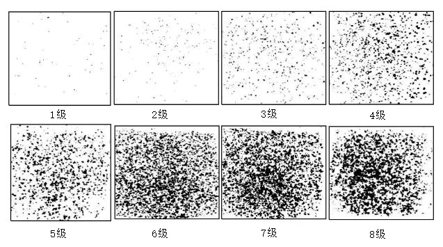將試樣表面涂層的破損、脫落情況與標準特征類型(石擊等級識別圖)比較、分析,以判定該涂層的抗石擊性能。(參考下圖)